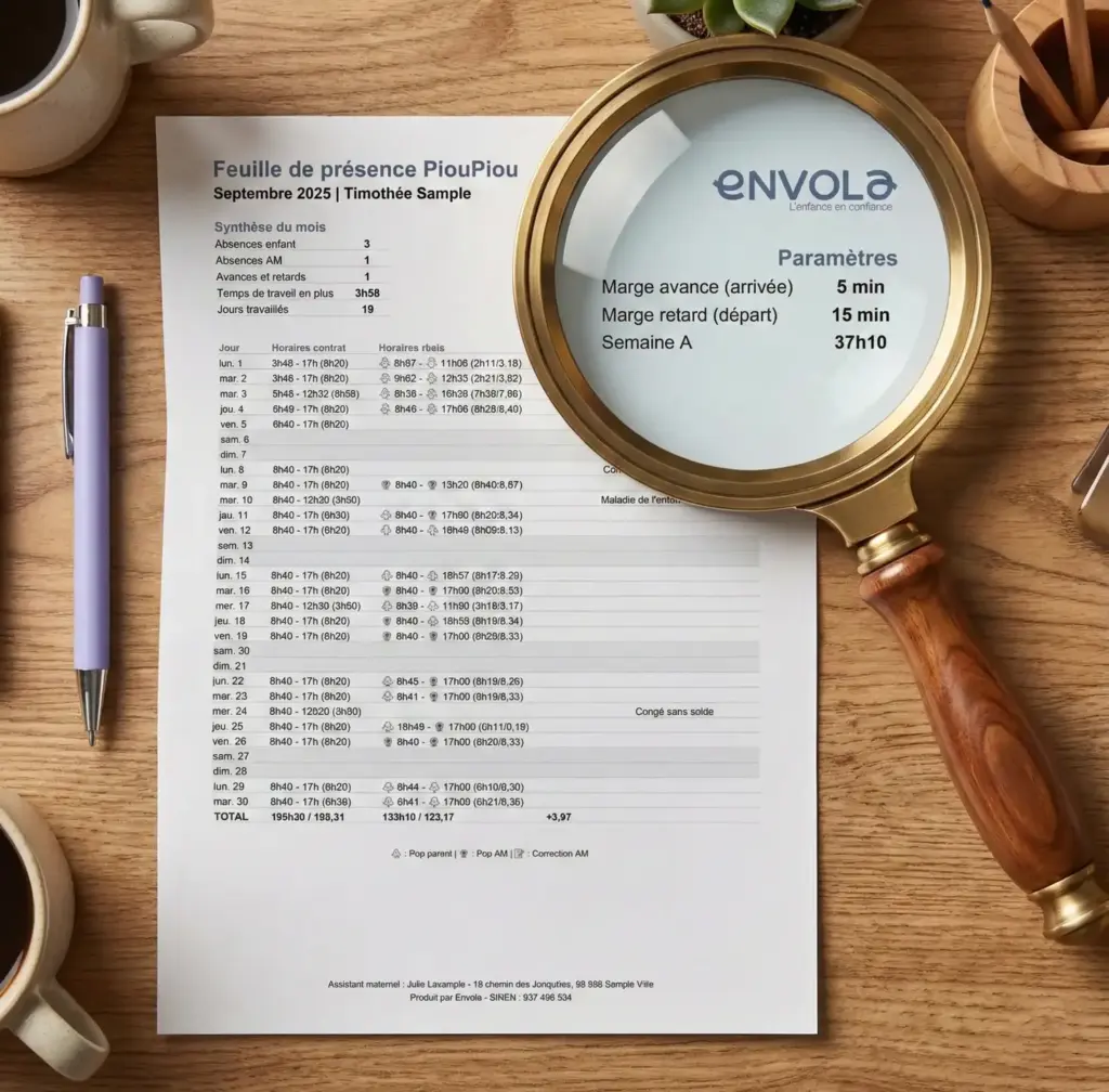 Votre feuille de synthèse mensuelle récapitule automatiquement toutes les données horaires : présences, absences avec motifs, avances, retards. Ces documents, éditables à tout moment, peuvent être transmis directement aux parents employeurs.